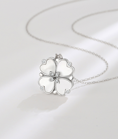 Nowadays, it’s mostly associated with St. Patrick’s Day celebrations and Elon Musk’s SpaceX. Across different cultures and eras, the four-leaf clover has acquired a wide array of meanings, mainly including: Faith, Hope, Love, and Luck. This silver necklace, consists of four individual pendants, can actually be worn in 2 ways. When they gather they form a standard four-leafed clover and when they don't they are individual hearts/leaves, which, as we learned, stand for Faith, Hope, Love, and Luck.